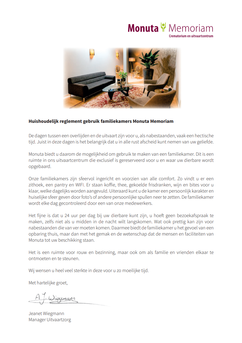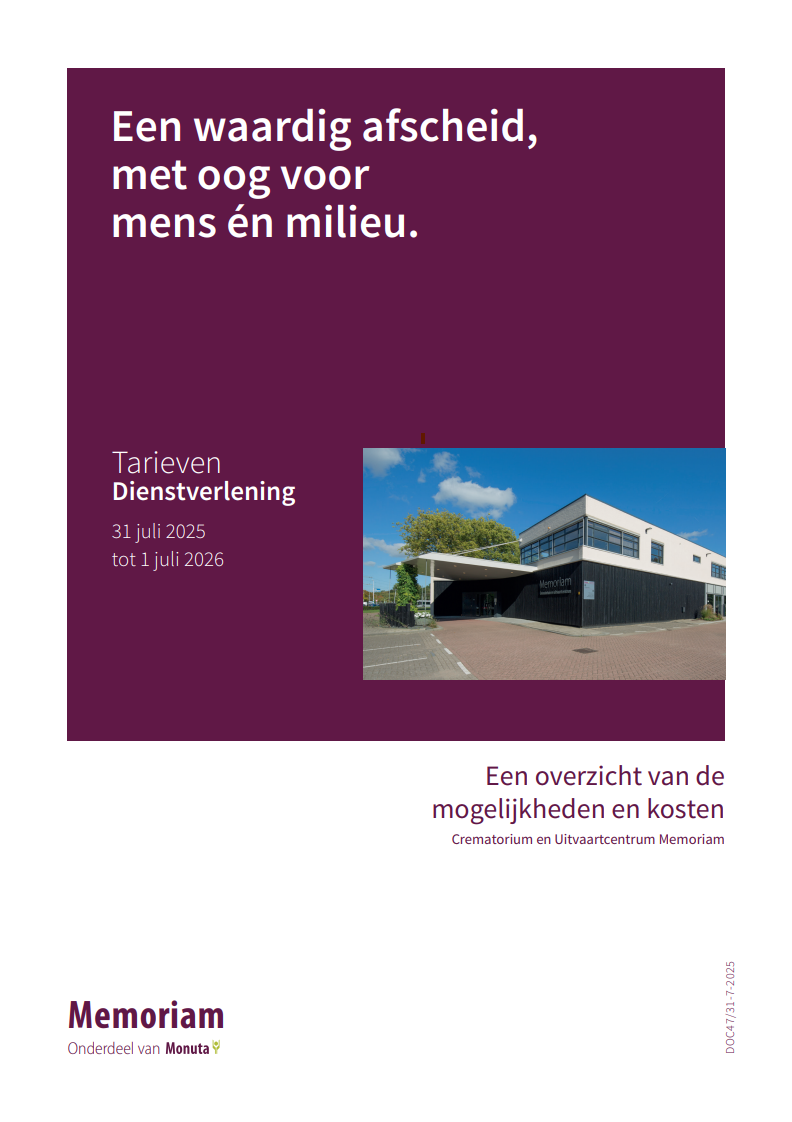 Als uitvaartondernemer kunt u gebruik maken van de locatie en alle faciliteiten van Monuta Memoriam. Hieronder treft u onze brochure, tarievenlijst en huisregels. Hierin vindt u alle nodige informatie. Mocht u een uitvaart bij Monuta Memoriam willen verzorgen, dan kunt u deze eenvoudig online aanmelden.